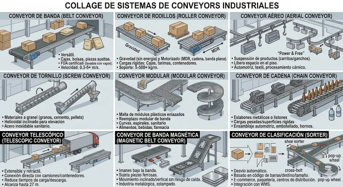 La industria ha desarrollado múltiples configuraciones de transportadores para necesidades muy distintas. Conocer las diferencias entre cada tipo es el primer paso para tomar una decisión de compra fundamentada.- Conveyor de banda. El más versátil y utilizado a nivel mundial, conocido en la industria internacional como belt conveyors. La banda se fabrica en PVC, poliuretano, caucho o materiales especiales según la industria. Ideal para transportar cajas, bolsas, piezas sueltas y productos con superficies irregulares. En la industria alimentaria se emplean bandas con certificación FDA que resisten lavados con vapor y químicos de sanitización. Su velocidad típica oscila entre 0.3 y 3 metros por segundo, aunque existen modelos de alta velocidad que superan los 5 m/s.