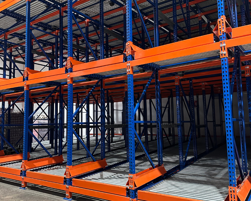 Los rieles están equipados con rodajas o rodillos de alta resistencia y frenos de seguridad que controlan la velocidad de descarga, aportando un flujo controlado y seguro. La estructura incorpora una lanzadera especial que facilita la manipulación de productos entarimados, optimiza cada pasillo del almacén para máxima productividad.